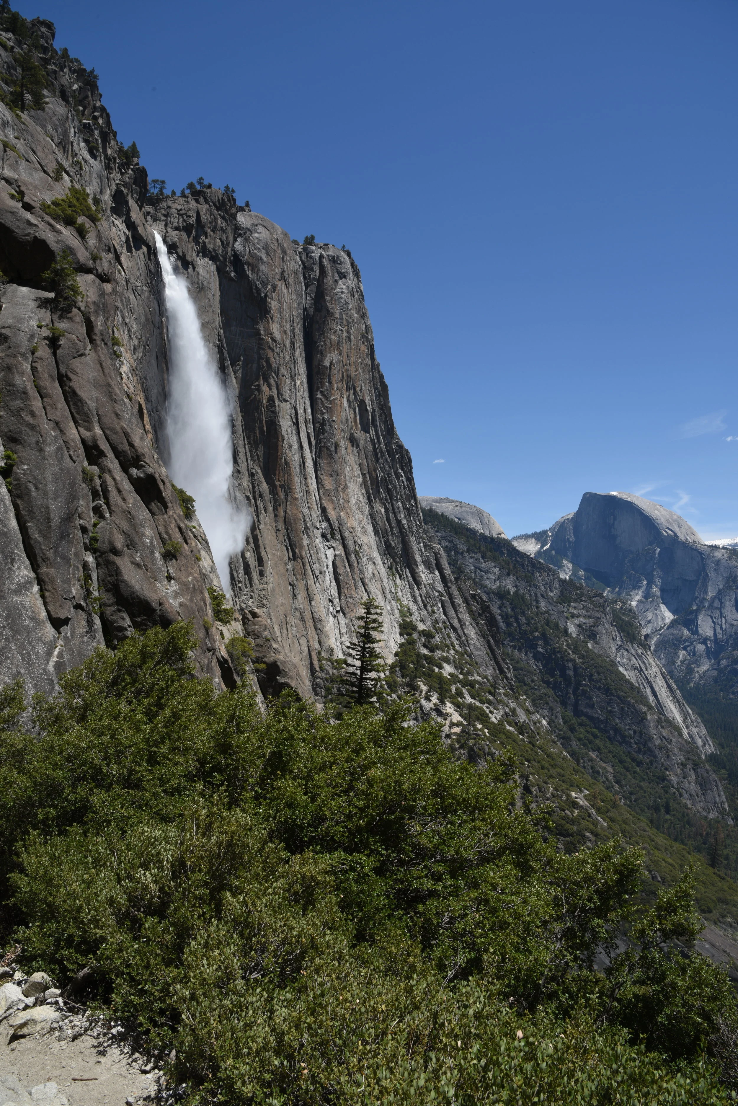 Upper Yosemite Falls and Half Dome, as seen from the Yosemite Falls trail.